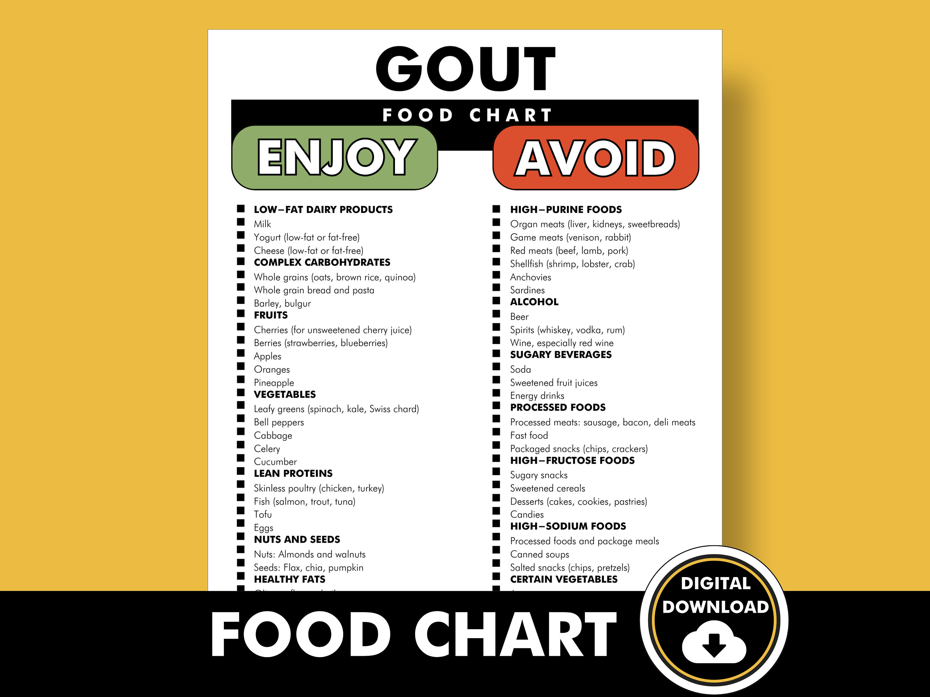 Gout Food Chart Diet Cheat Sheet Food List Meal Plan Grocery List