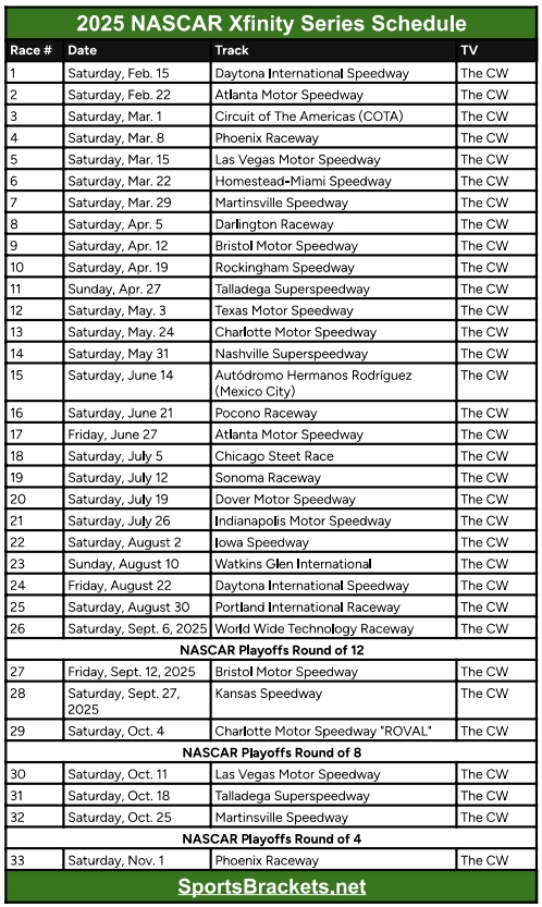 Printable NASCAR Xfinity Series Schedule 2025