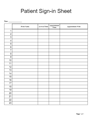 Patient sign in sheet template in Word and Pdf formats
