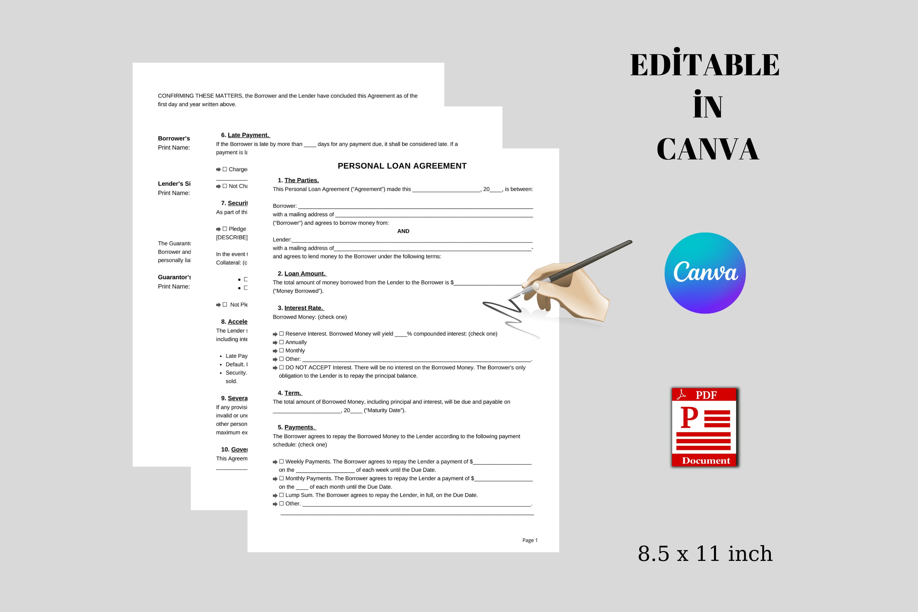 Printable Personal Loan Agreement: Editable Contract Template (canva