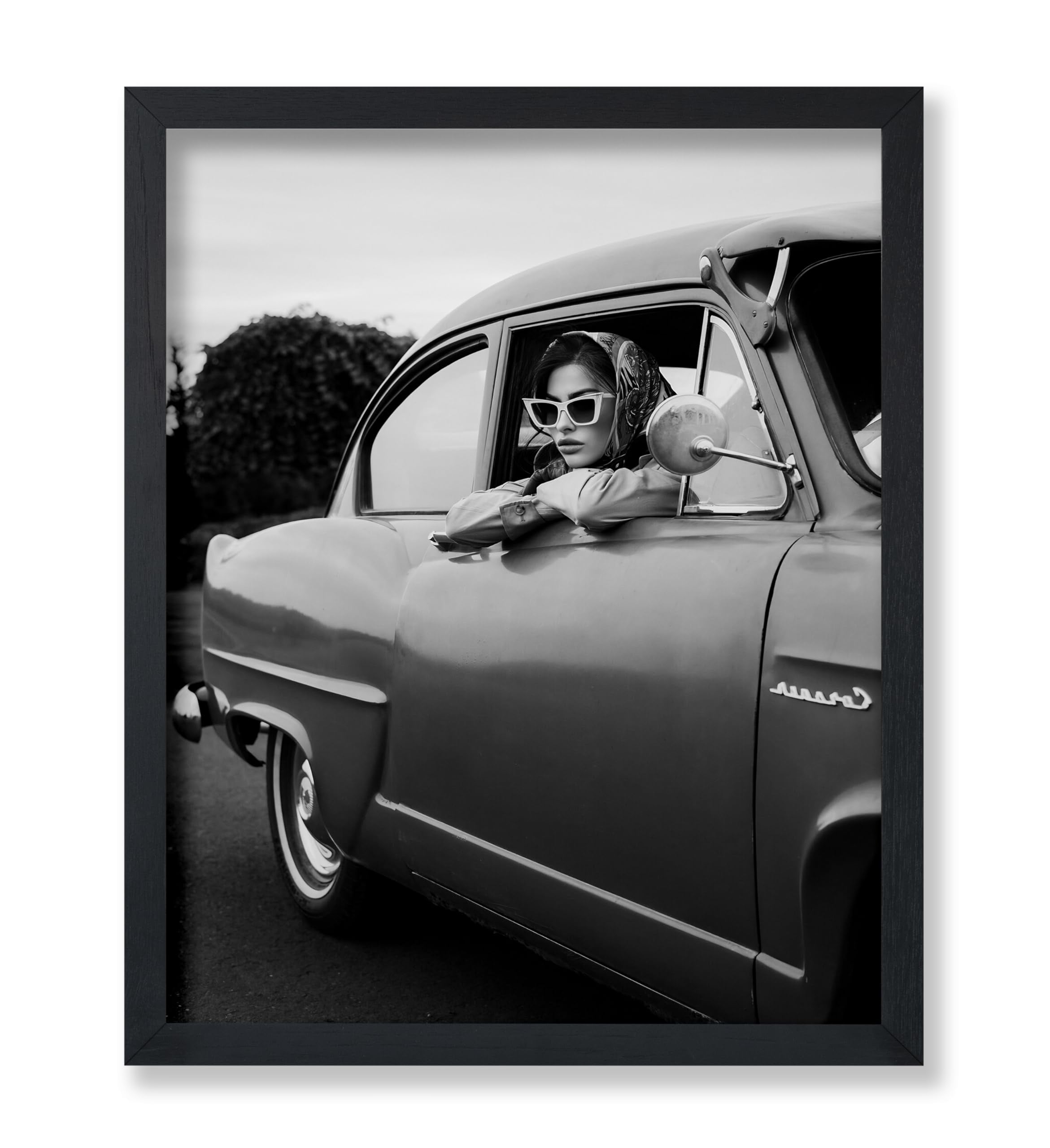 Poster Master Fashion Poster Woman in Classic Car Print Black and
