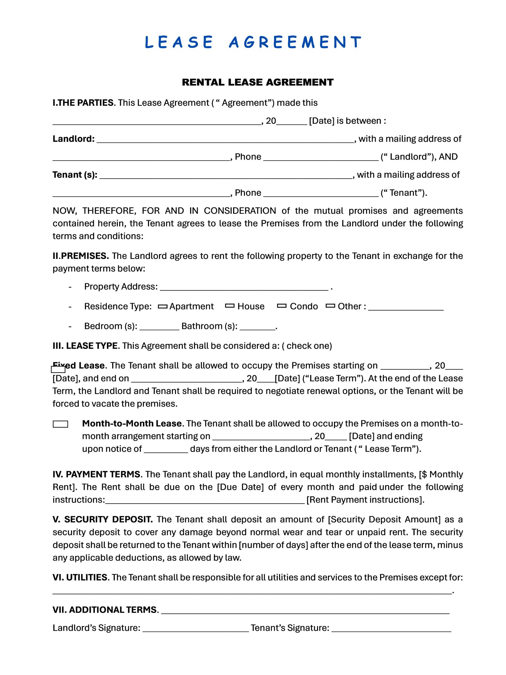 Download Free Basic Rental Agreement or Residential Lease Printable