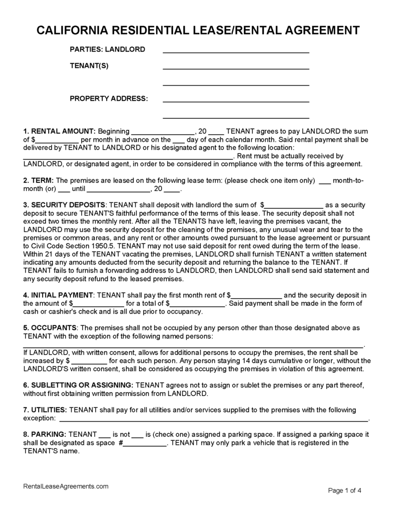 Free Printable Rental Lease Agreements Form (TEMPLATE)