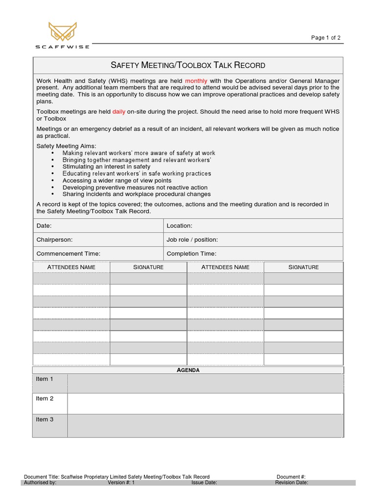 Safety Meeting Toolbox Talk PDF Occupational Safety And Health Safety