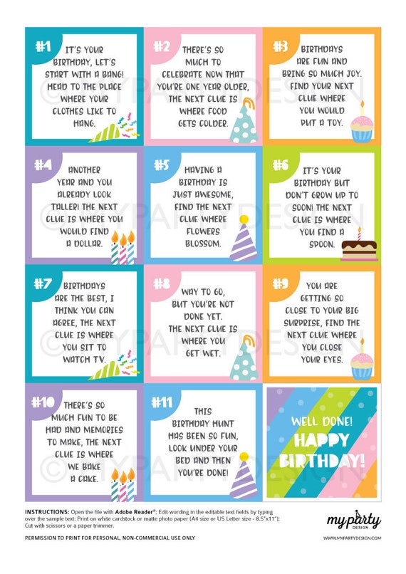 Birthday Scavenger Hunt Cardsbirthday Scavenger Hunt Clues Printable