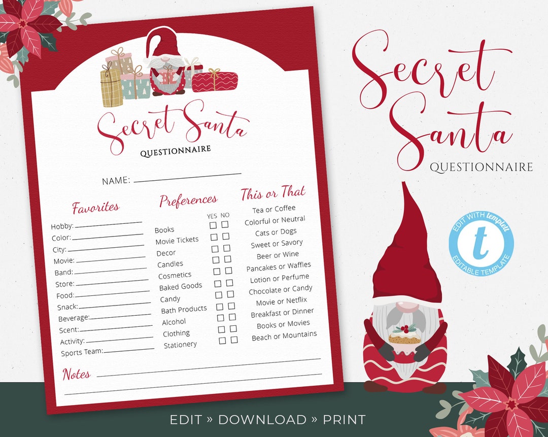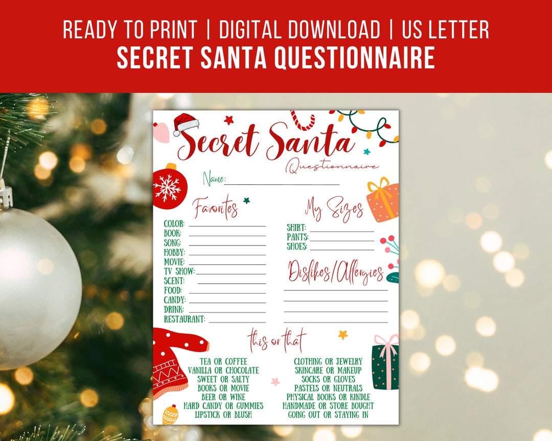 Secret Santa Questionnaire for Gift Exchange Printable LittleSizzle