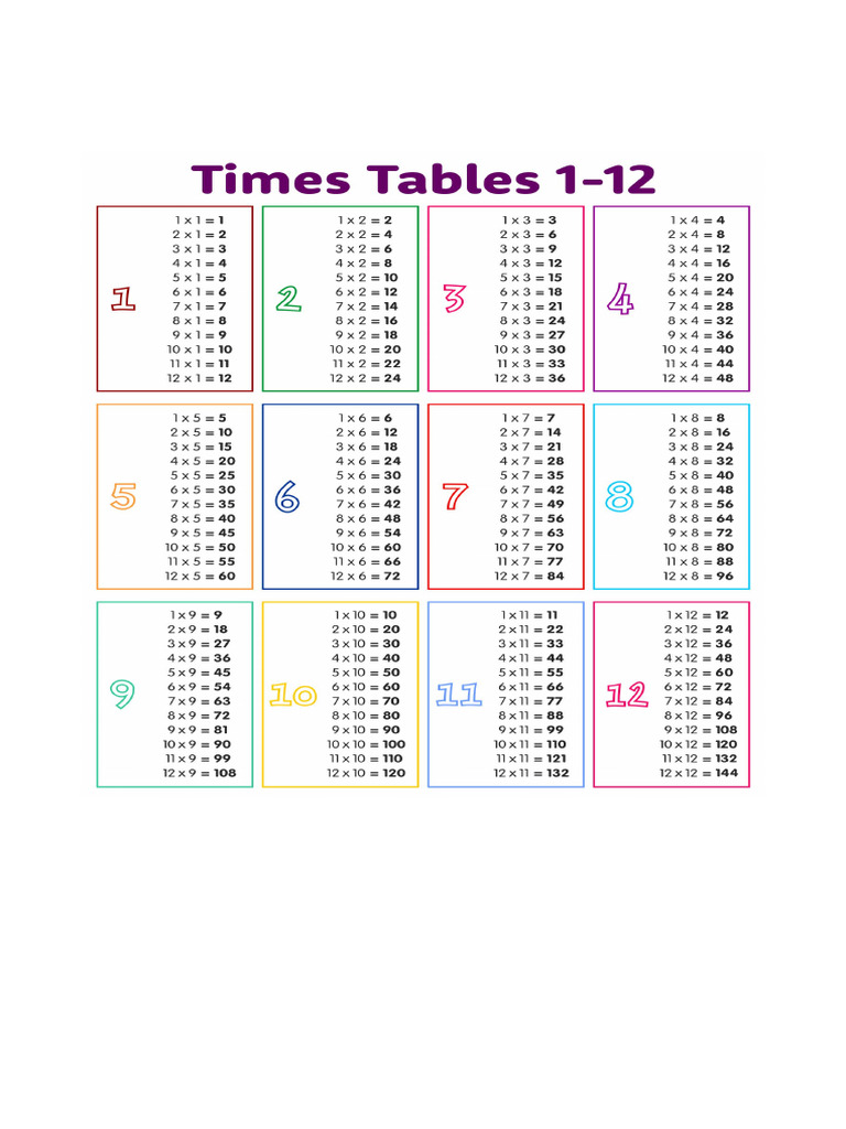 Times Tables Wall Chart Poster Children Kids Education Worksheets