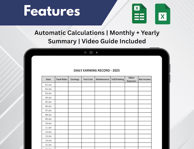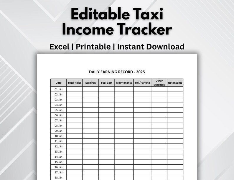 Taxi Driver Income Expense Tracker Template Printable Uber Lyft