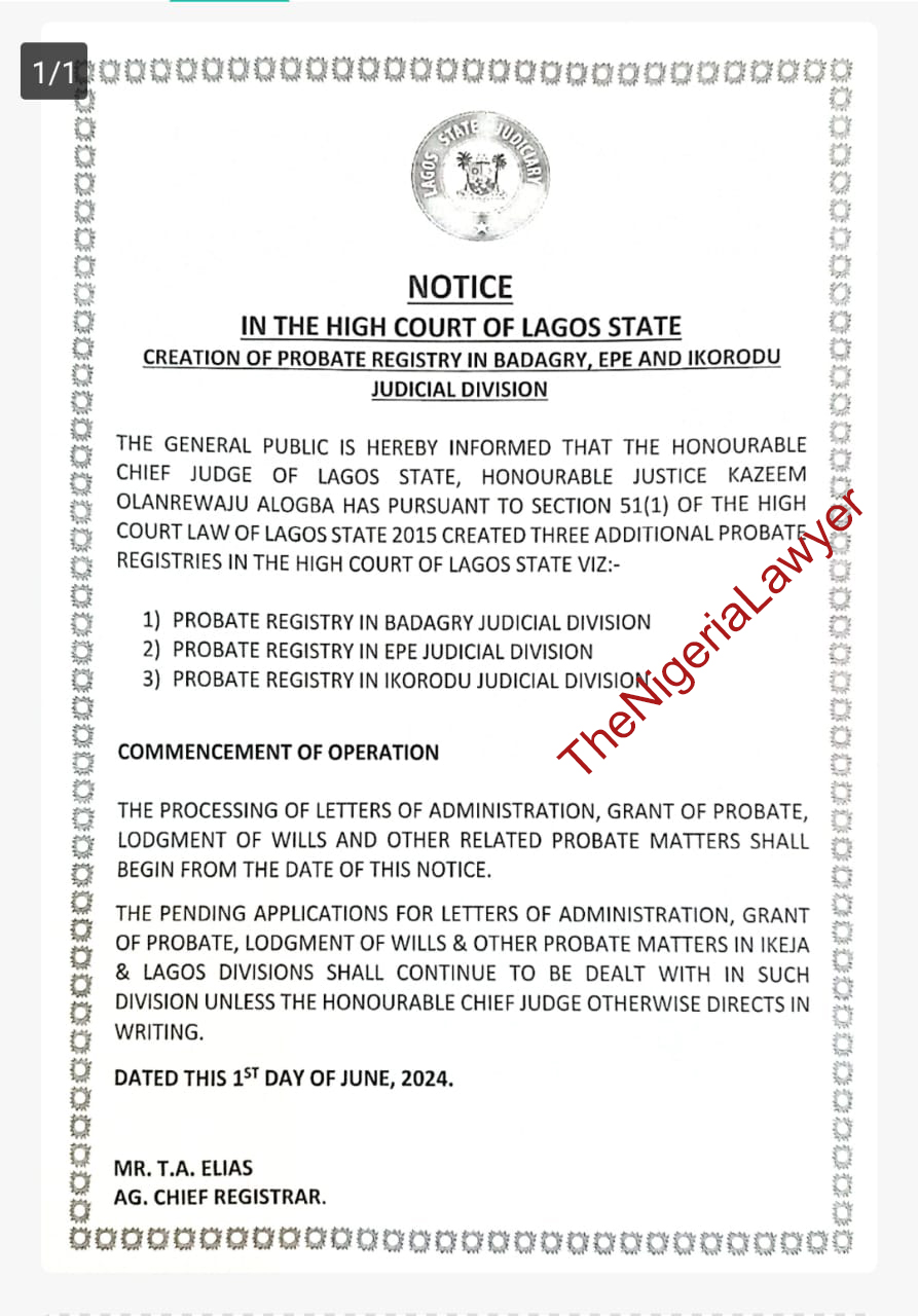 Lagos State High Court Establishes Probate Registries In Badagry Epe
