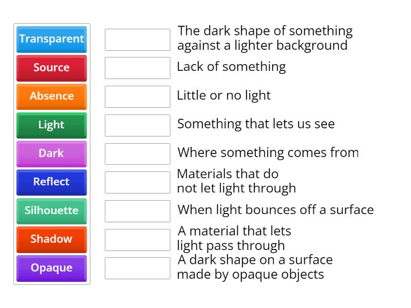 Y3 Science Light and Shadows Crossword Match up