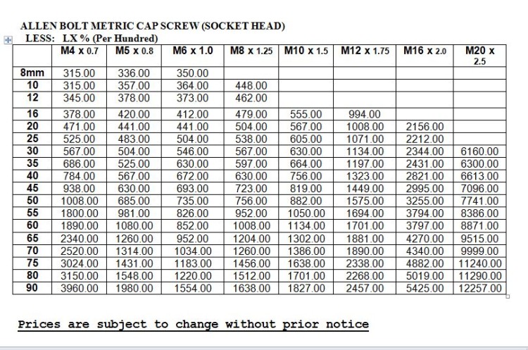 ALLEN BOLT METRIC CAP(SOCKET HEAD) Pricelist Philippines