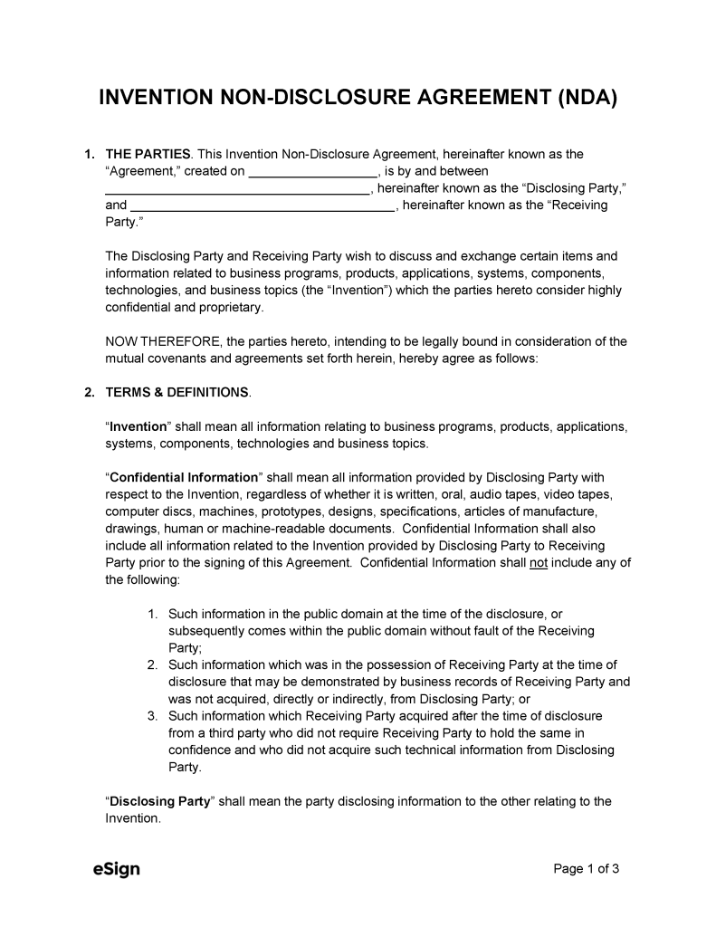 Free Invention (Patent) Non Disclosure Agreement (NDA) PDF Word