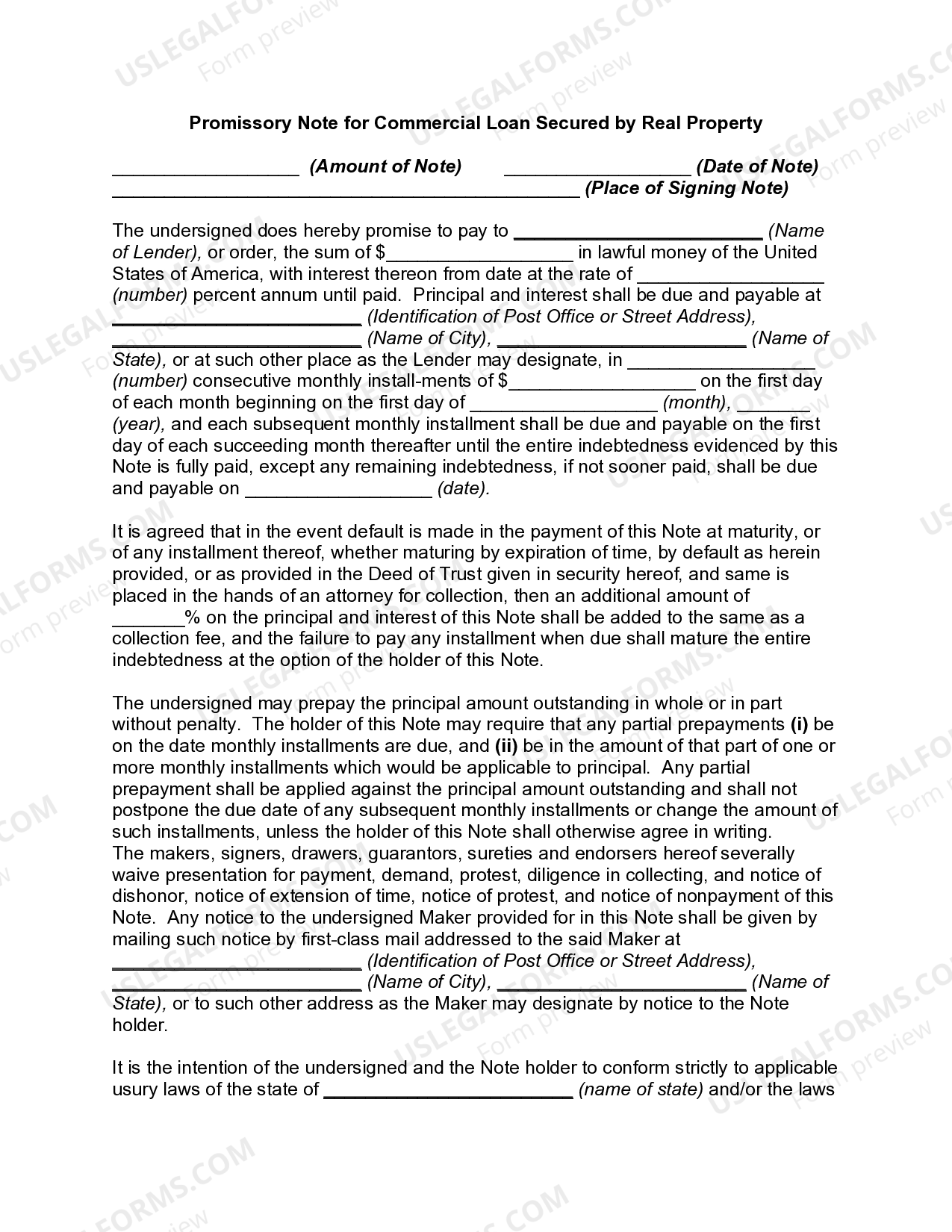 Utah Promissory Note for Commercial Loan Secured by Real Property