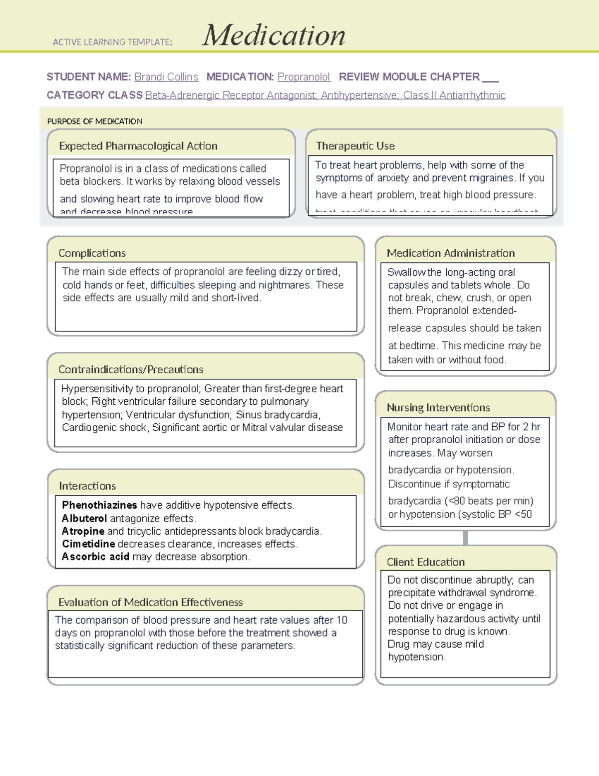 Propranolol Medication Template ACTIVE LEARNING TEMPLATES