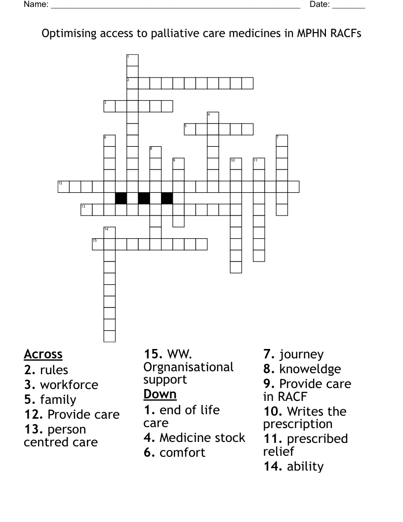 Optimising access to palliative care medicines in MPHN RACFs Crossword