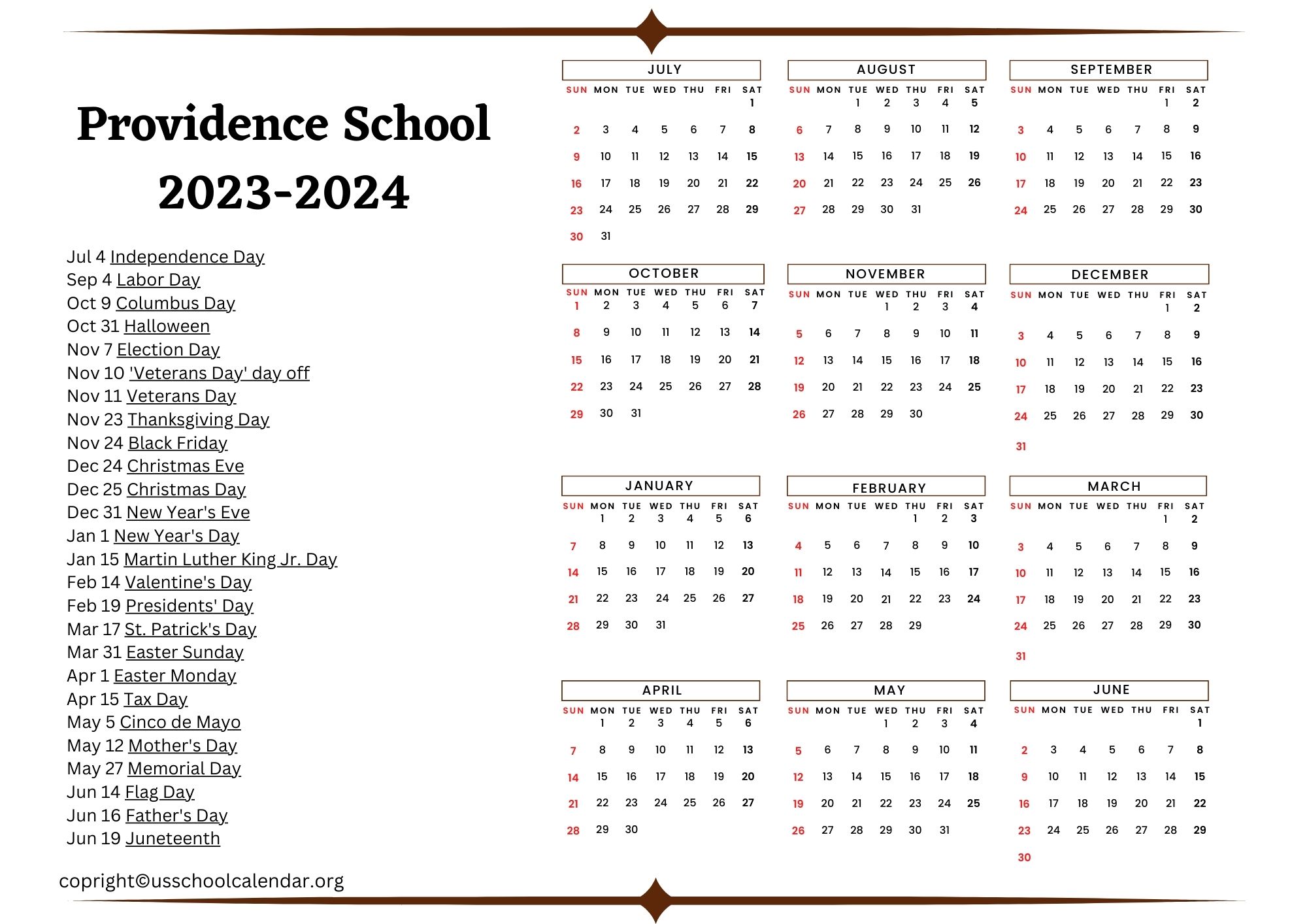 Providence School Holidays US School Calendar