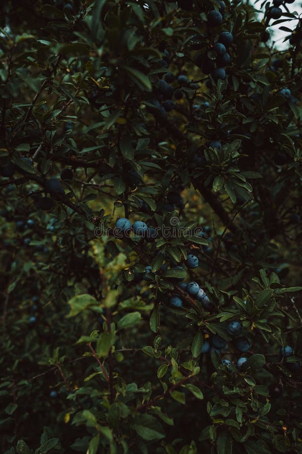 Vertical Closeup of Prune Branches with Leaves on the Blurred Dark