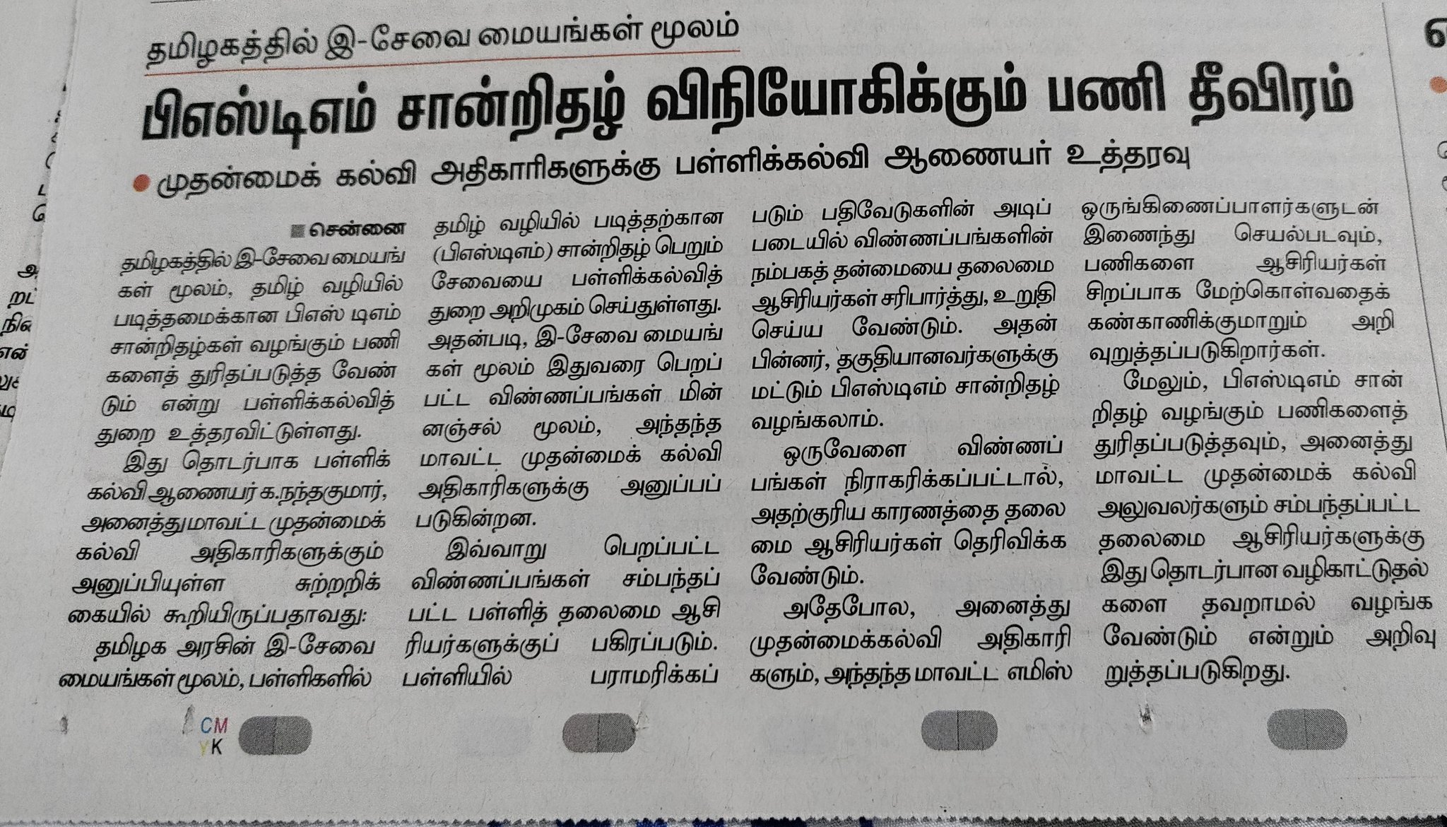 Pstm Certificate தமிழ் வழியில் படித்ததற்கான சான்றிதழை இனி இ சேவை