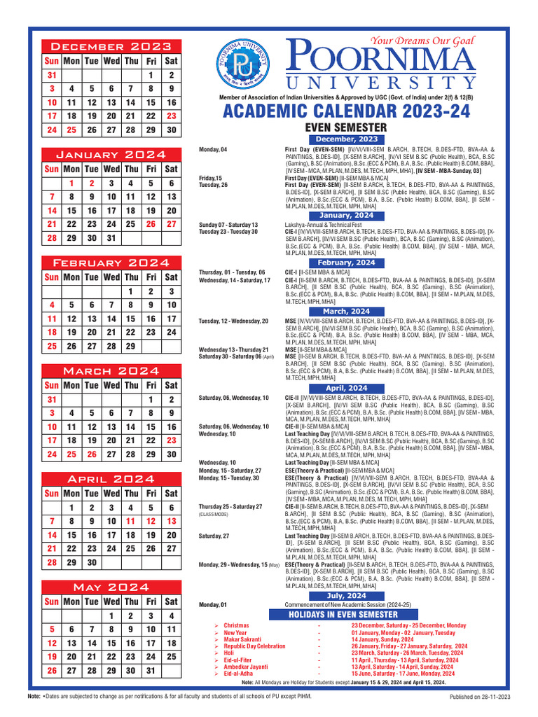 PU Academic Calendar (Even 2023 24) PDF