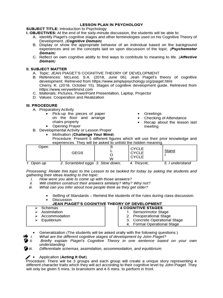 Lesson Plan in Psychology PDF Cognition Cognitive Psychology