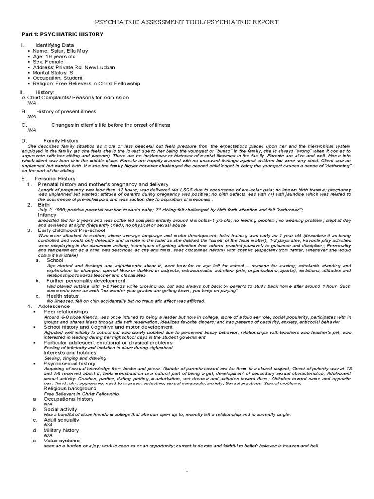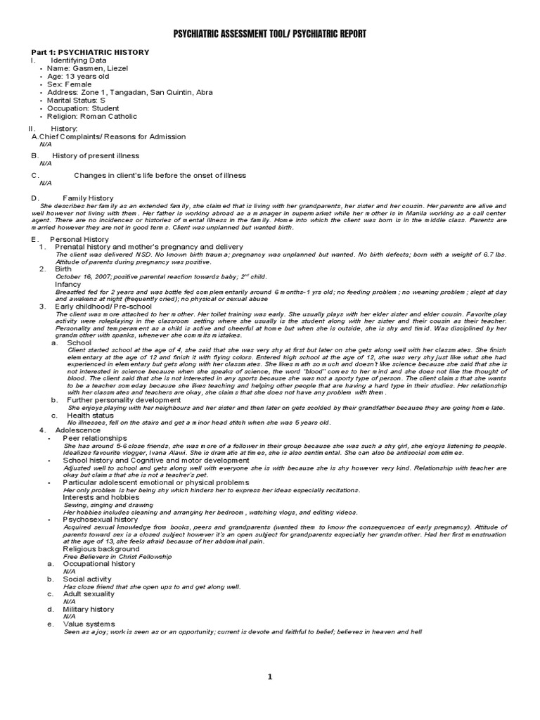 Psychiatric Assessment Tool/ Psychiatric Report PDF Adolescence