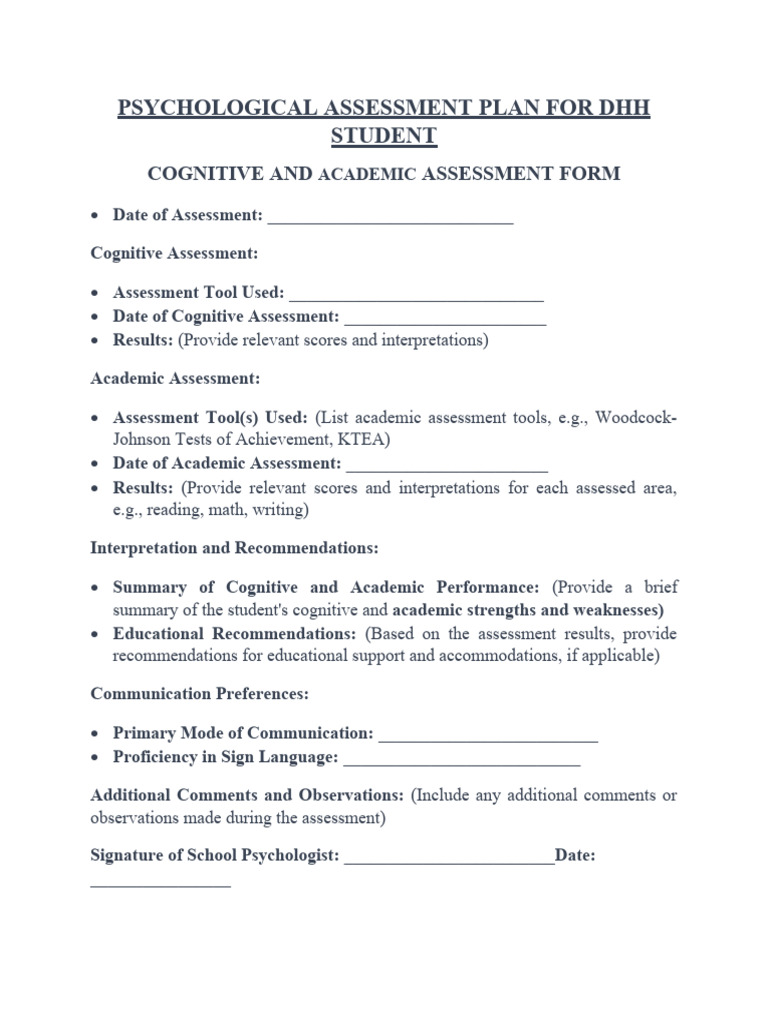 Psychological Assessment Plan Forms For DHH PDF Social Skills
