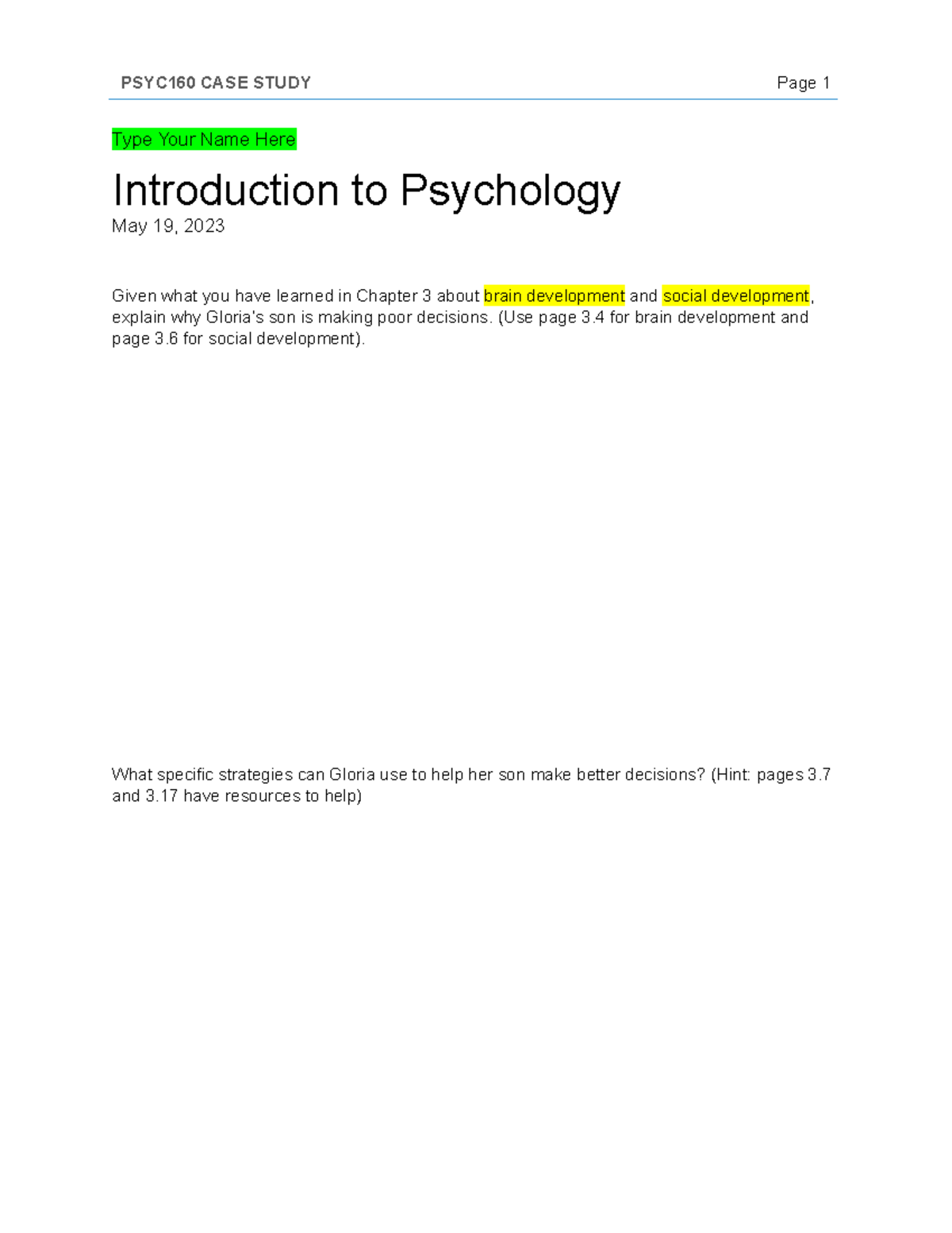 Casestudy Psy101 Type Your Name Here Introduction to Psychology