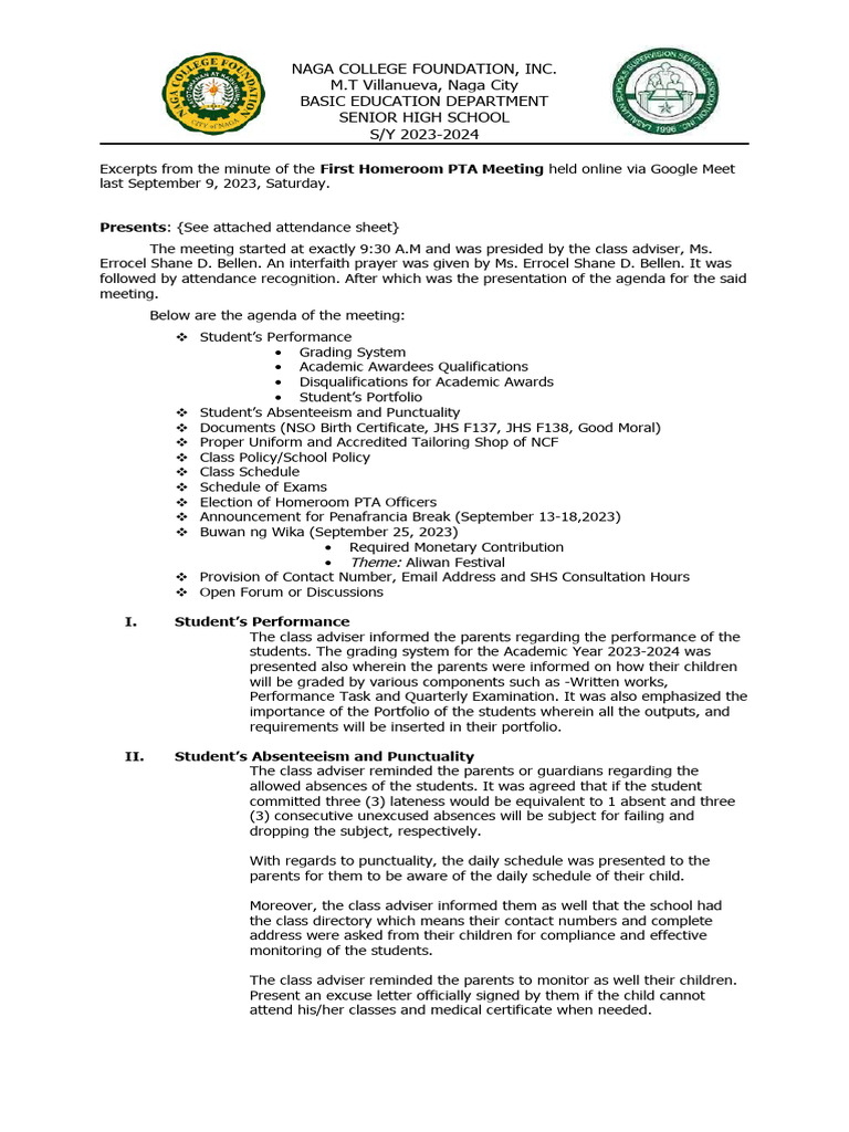 Pta Meeting Agenda Template