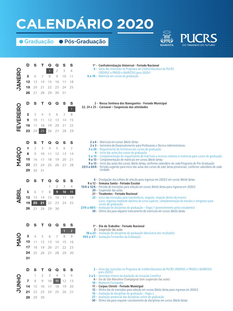 Calendário Acadêmico PUCRS 2020 PDF Pós graduação Formação