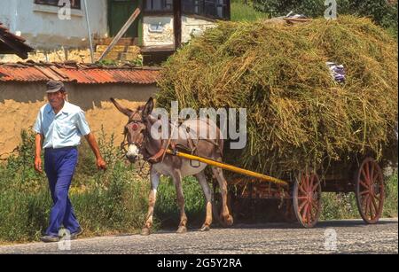 A farmer leads his donkey pulling a wagon carrying his family and sheep