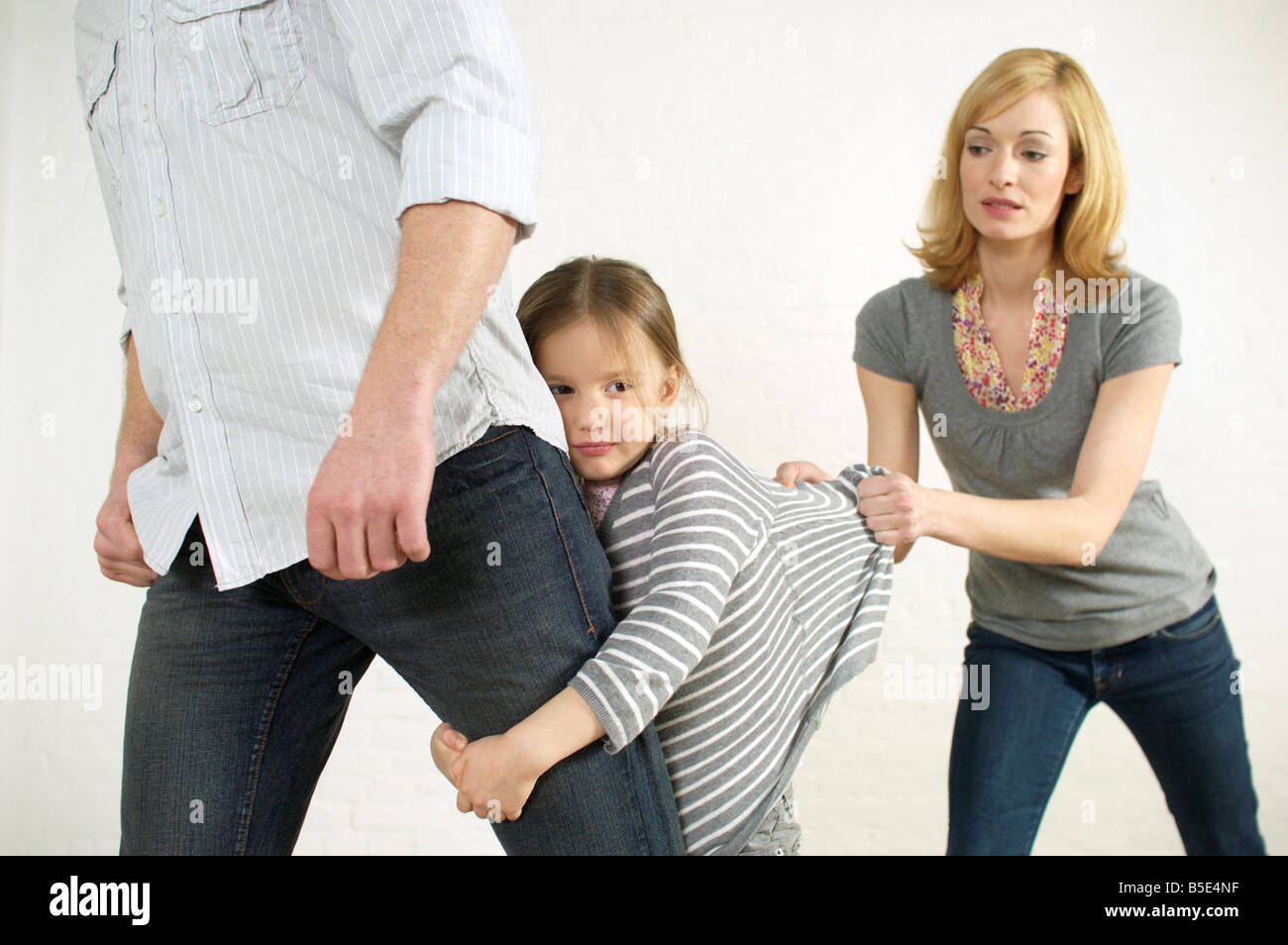 Girl clinching father #39 s leg mother pulling at daughter #39 s sweatshirt