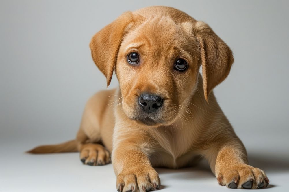 A cute yellow Labrador Retriever puppy sitting obediently indoors on a