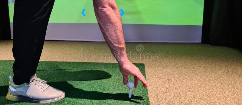 Golfer in Studio Put Golf Ball on Tee To Play on Simulator Stock Photo