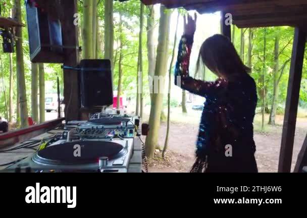 Woman dancing lasciviously and puts her headphones on Female Dj at