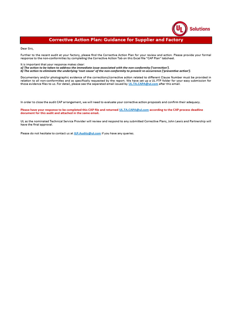 Sonia Fine Knit UL Audit CAP Report PDF Quality Assurance Risk