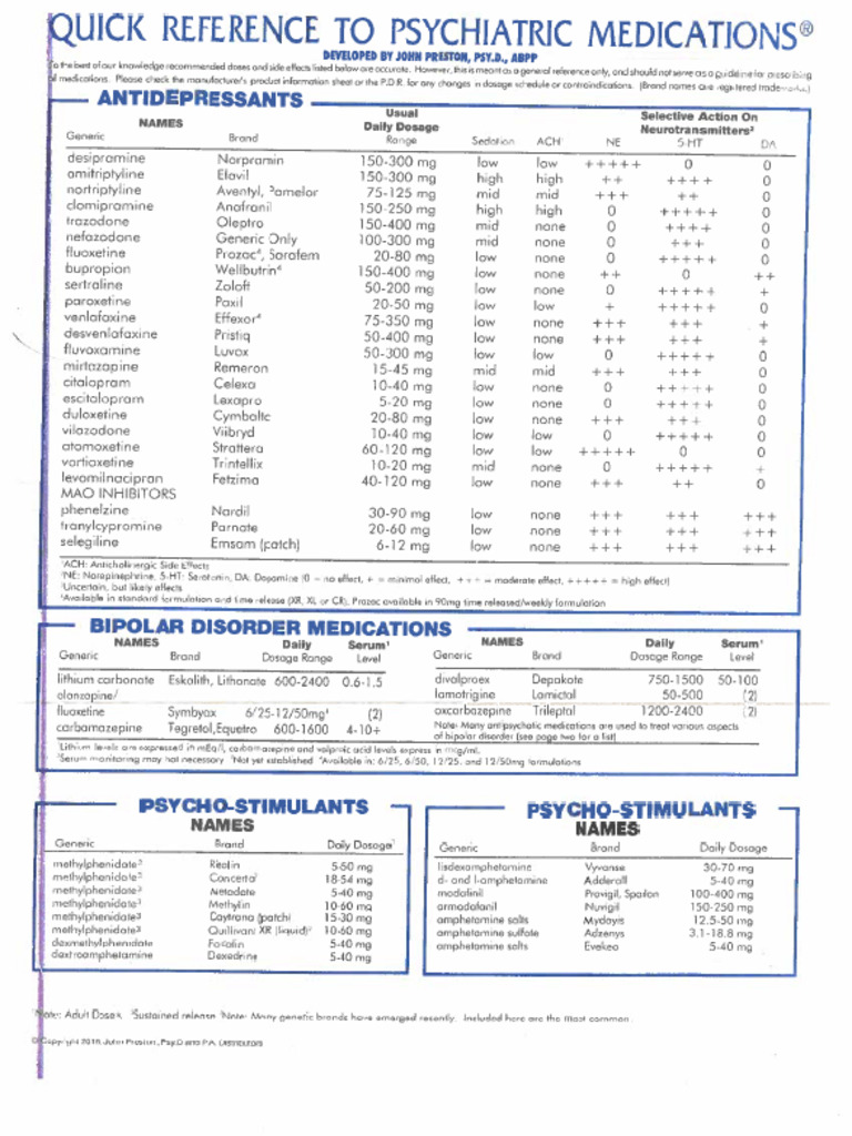 Printable Psychiatric Medications Cheat Sheet