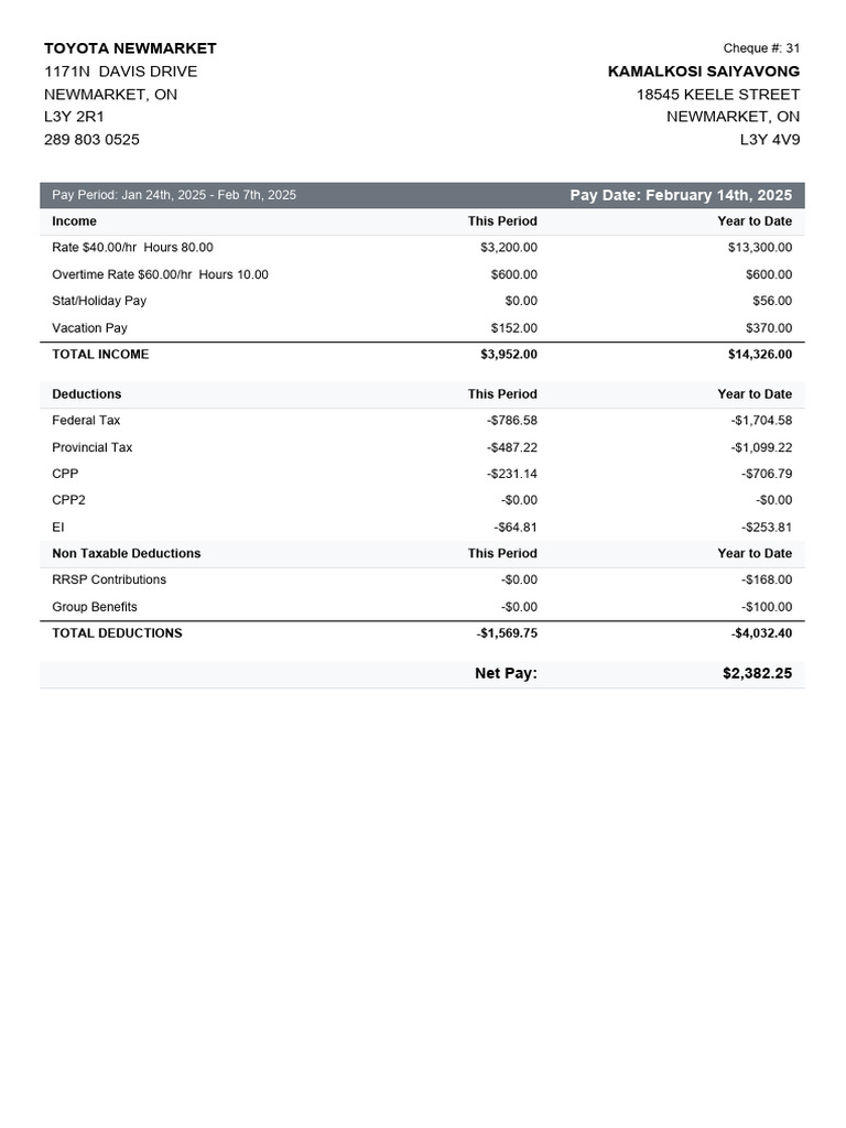 Employee Pay Stub Toyota Newmarket Kamalkosi Saiyavong 2025 02 14
