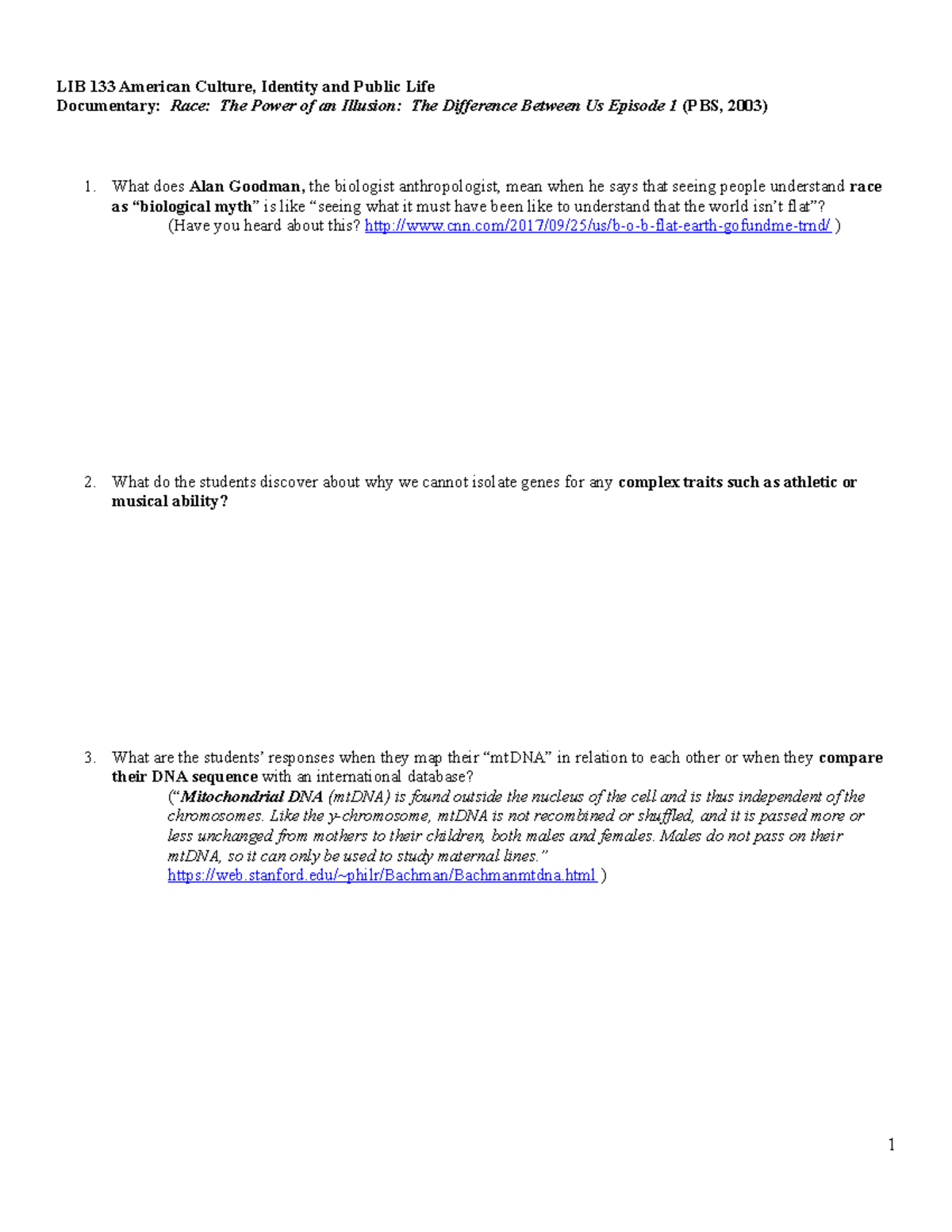 LIB 133 Discussion Questions Race the Power of an Illusion Episode 1