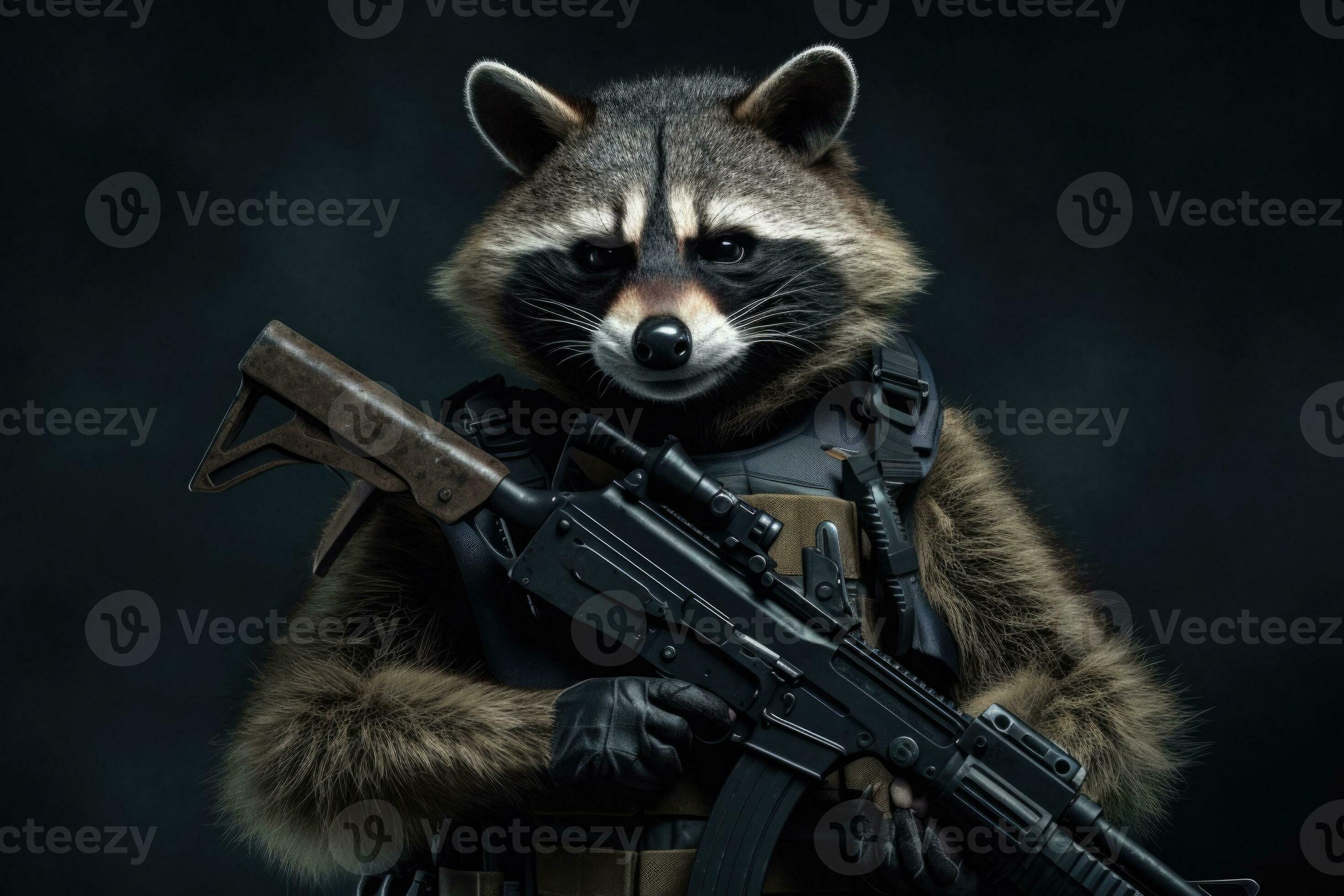 Racoon in body armor and with a machine gun Beast in an armor with