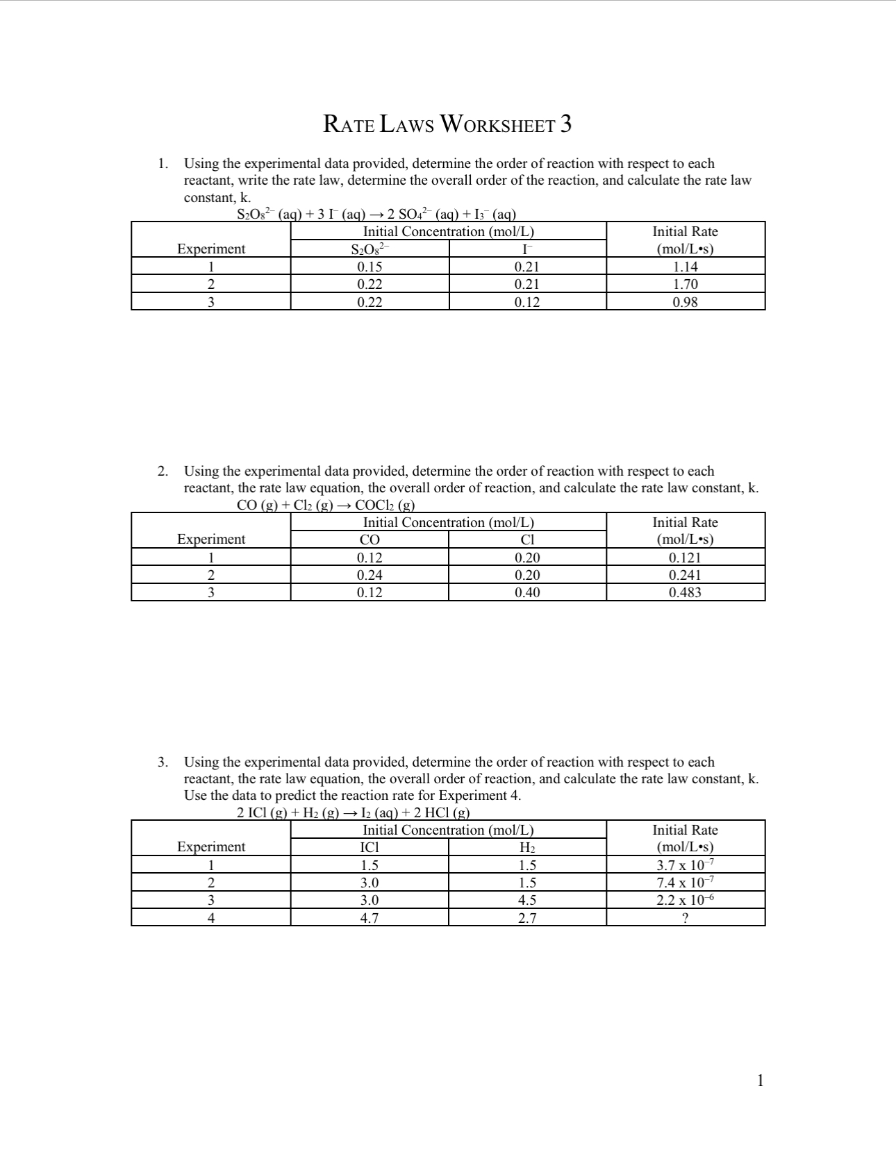 Rate Law Worksheet