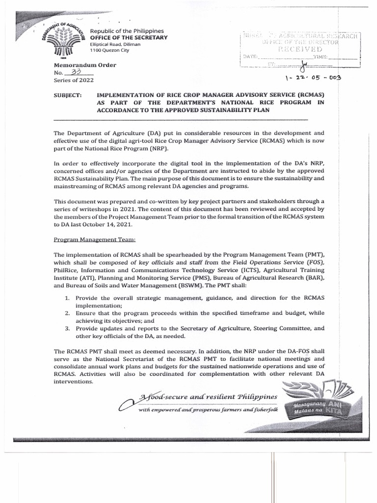 Implementation of Rice Crop Manager Advisory Service (RCMAS) As Part of