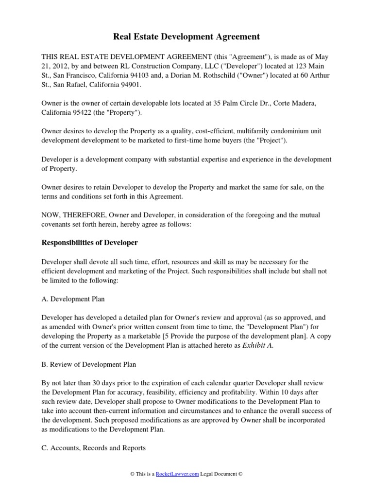 Free Real Estate Development Agreement Rocket Lawyer