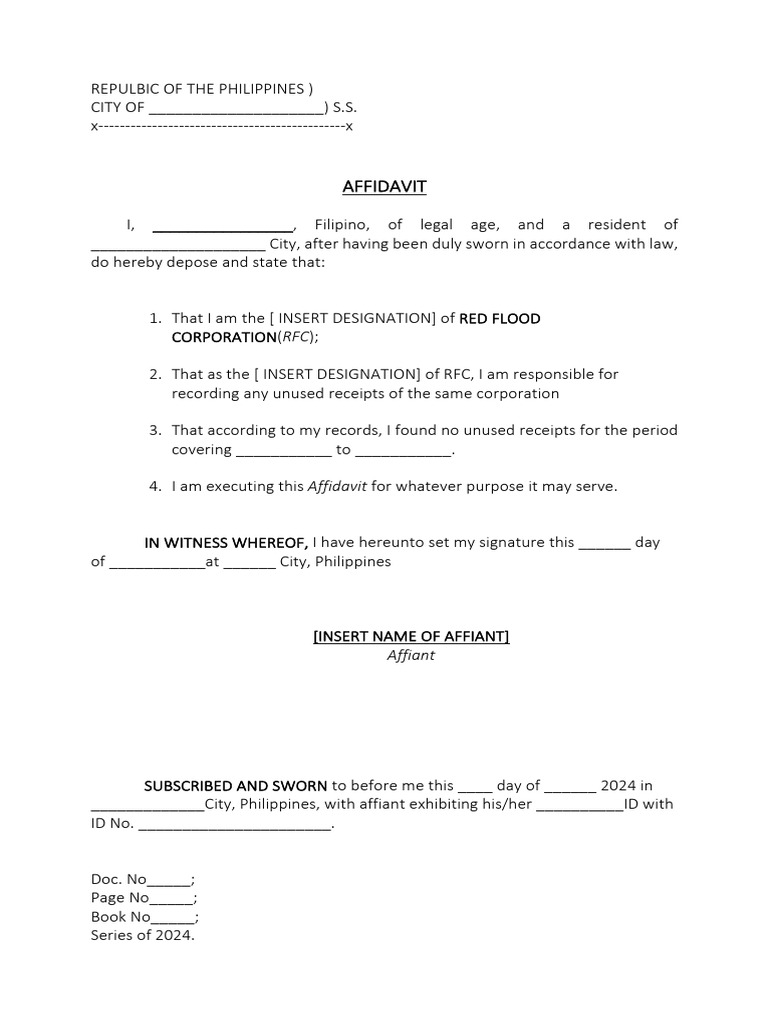 AFFIDAVIT OF NO UNUSED RECEIPTS TEMPLATE PDF