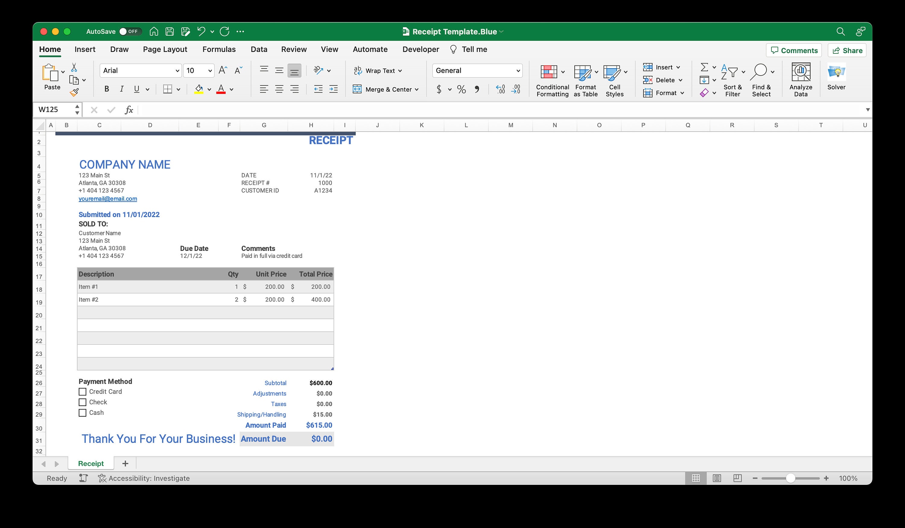 Business Receipt Template for Microsoft Excel Google Sheets (blue