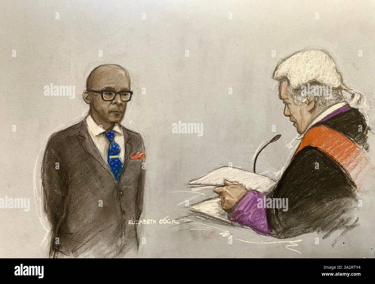 Court artist drawing by Elizabeth Cook of BBC presenter Jay Blades