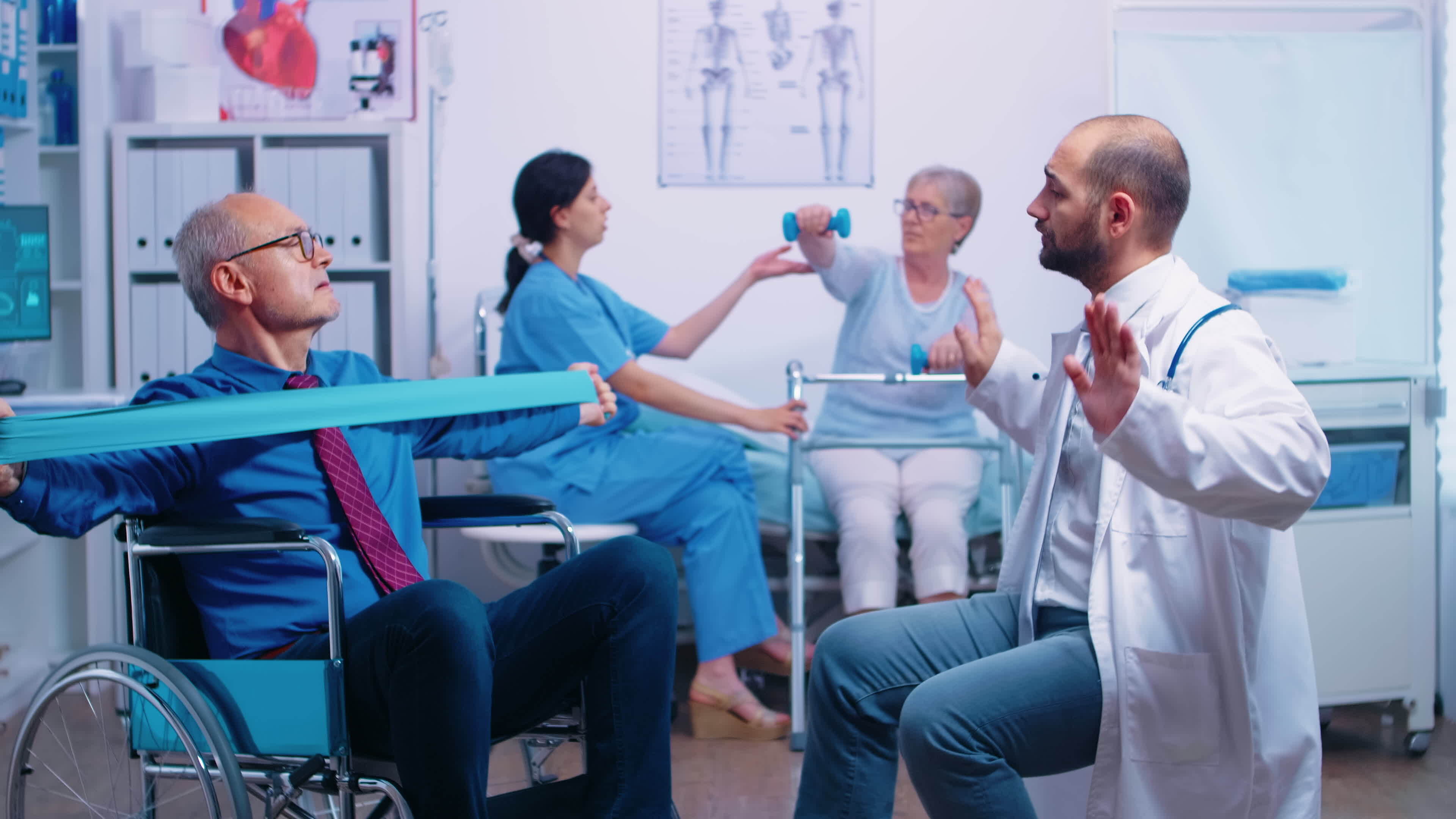 Elderly disabled man in wheelchair training muscle strength with