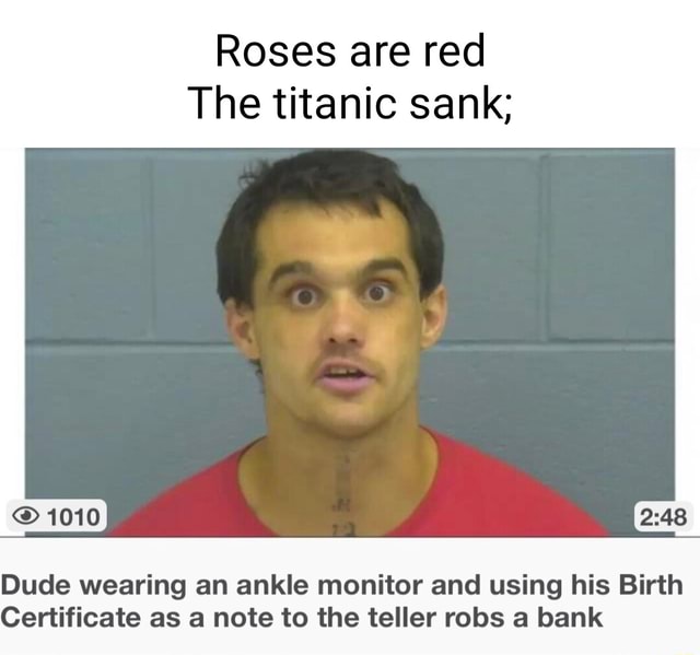 Roses are red The titanic sank Dude wearing an ankle monitor and using