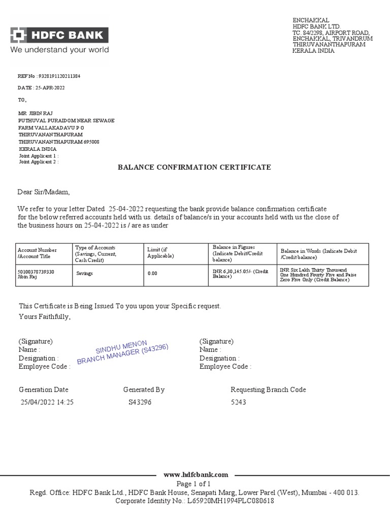 Jibin Balance Certificate HDFC PDF