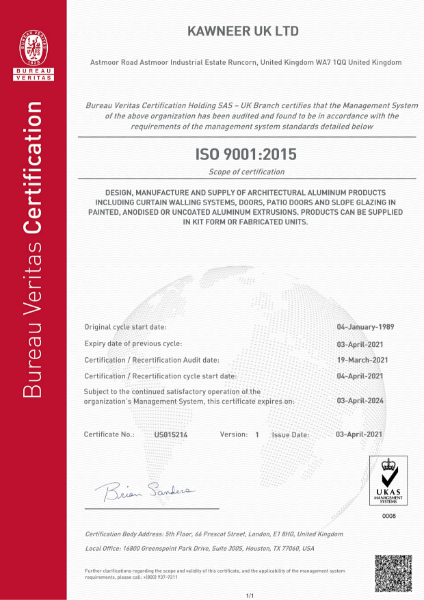 ISO 9001:2015 Certificate Kawneer UK Ltd NBS Source