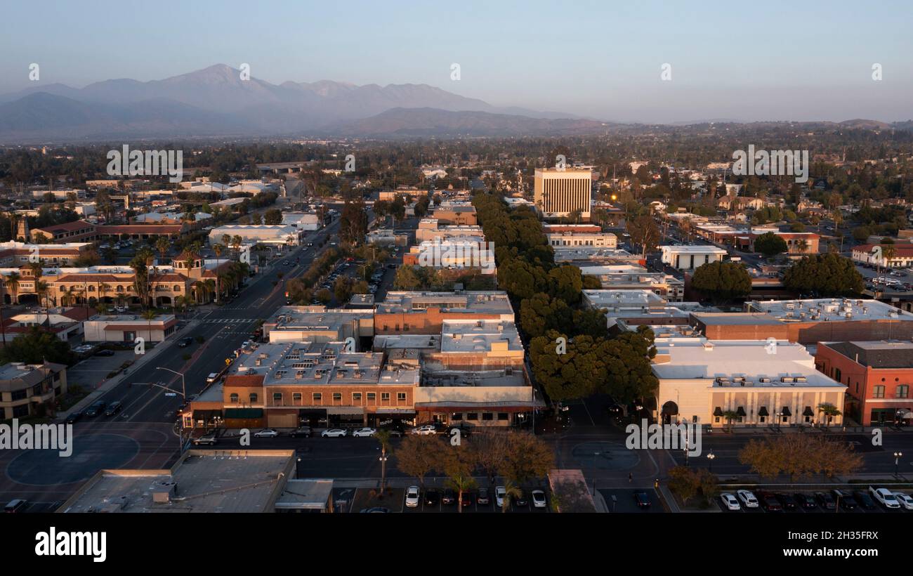 Sunset aerial view of historic downtown Redlands California USA Stock